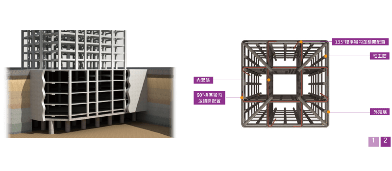 採用筏式基礎,均勻乘載建物重量,135度標準灣鉤箍筋工法鞏固核心,SA級鋼筋續接器,耐震高規格。