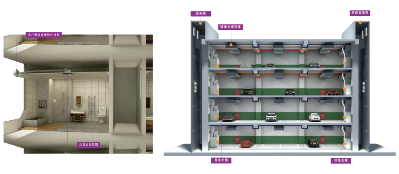 停車場自動化定時排氣設計,家戶內使用當層排氣,避免垂直交叉汙染,室內防臭,空氣品質更清淨,使用垃圾冷藏處理,低溫抑菌,不孳生病媒,乾淨又環保,家人健康更安心。