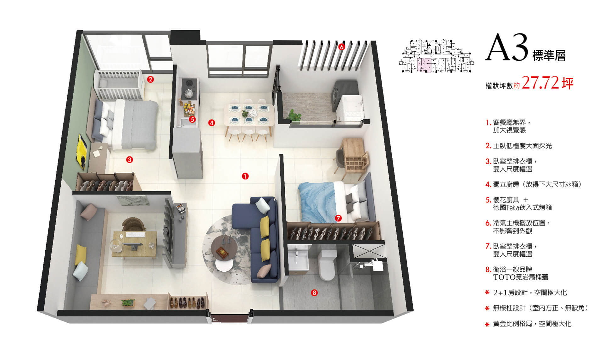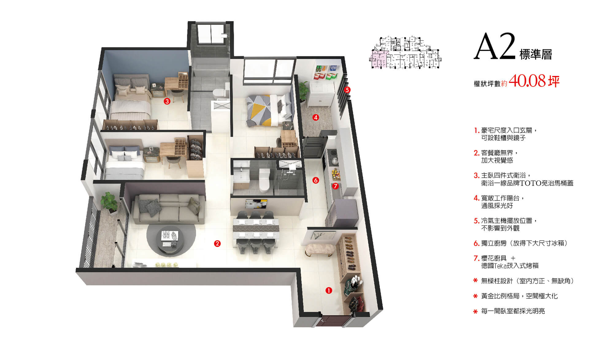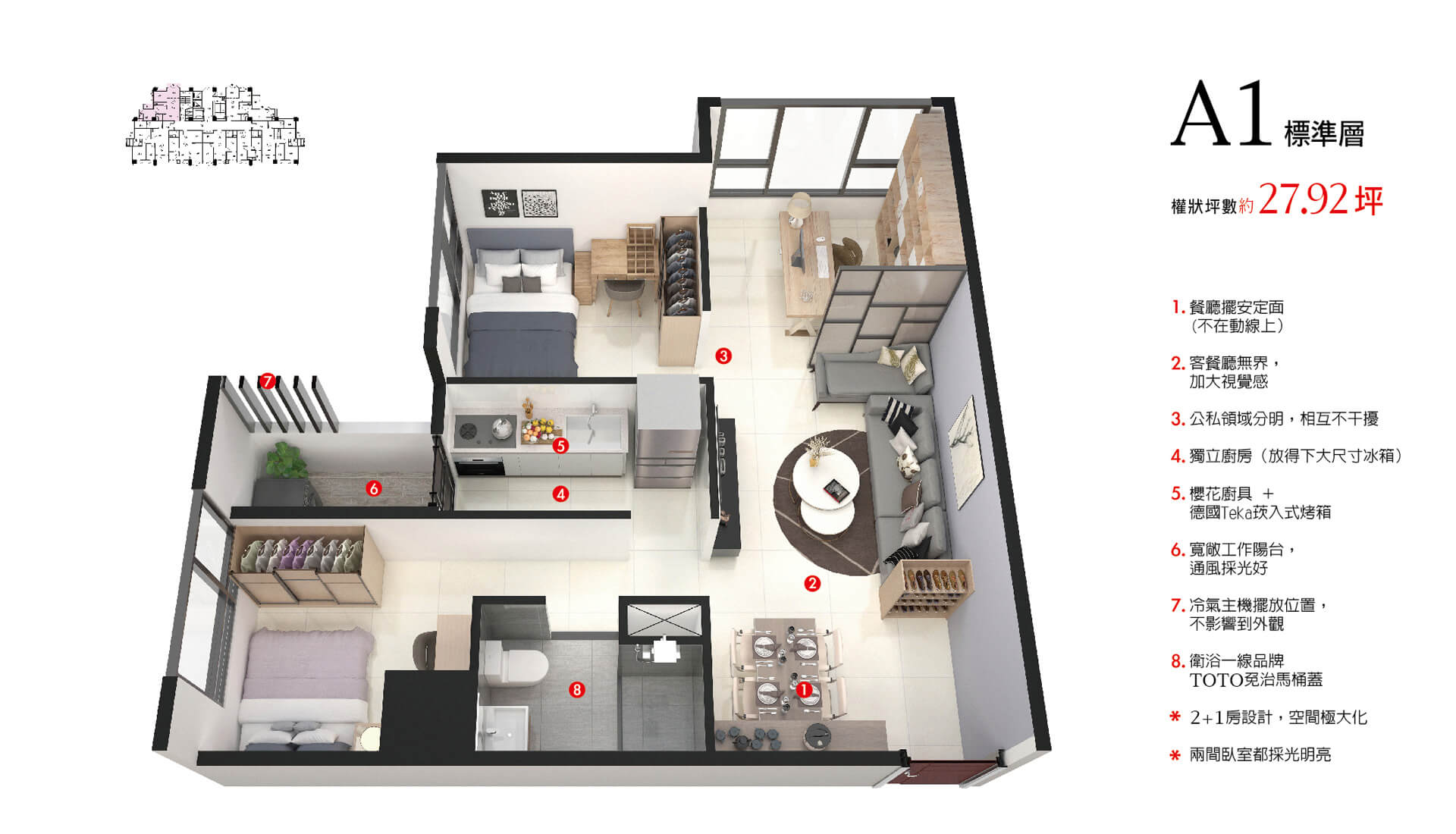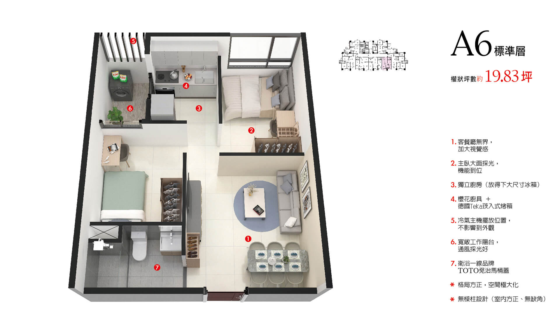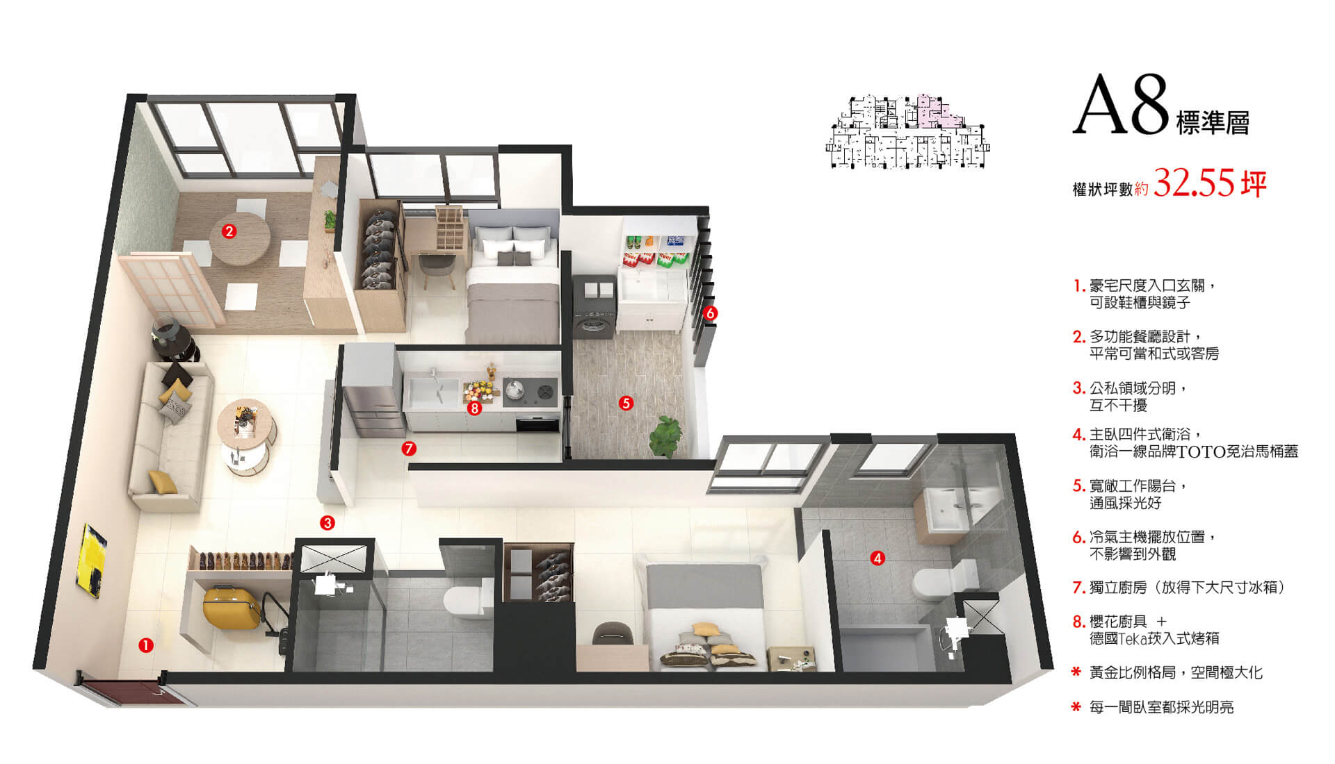 低檯度的大面採光,黃金比例的格局,部分格局無樑柱的設計,不浪費任何空間,加大視覺感!